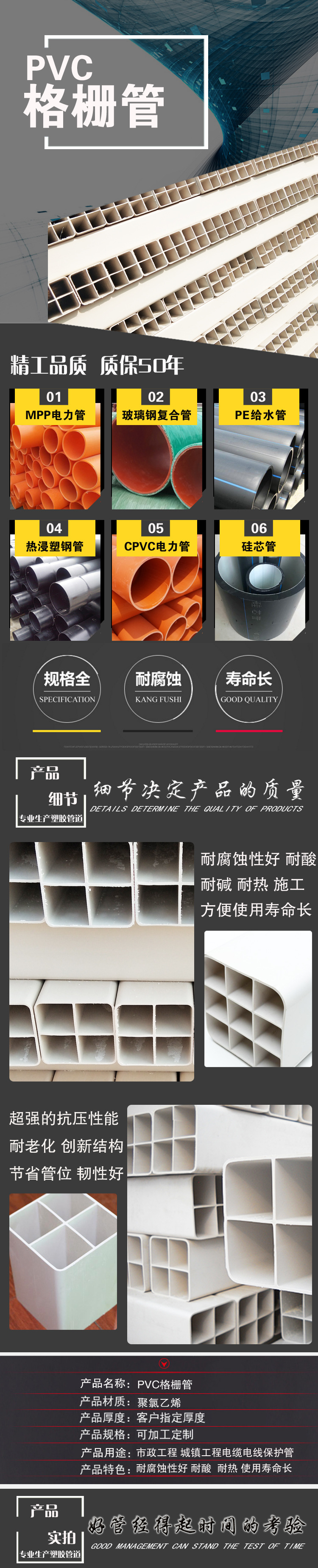 多孔格柵通信直埋管是一種新型光纜護套管,是集護套與子管為一體, 一次擠壓成型 造型美觀采用PVC工程塑料制作抗壓強度高,重量輕, 使用壽命長,內壁光滑,磨擦力小,施工方便,可抵抗外力影響保護 光、電纜功能的管子。有效空間大,方便于光纜的穿導、隔離及保護, 產品具有提高工效、節約成本、安裝方便、穩妥可靠等明顯優點。 廣泛適用于光纖通訊、有線電視、電力電纜多媒體傳輸等基礎工程, 是一種新型實用的光電通訊設施的配套產品
