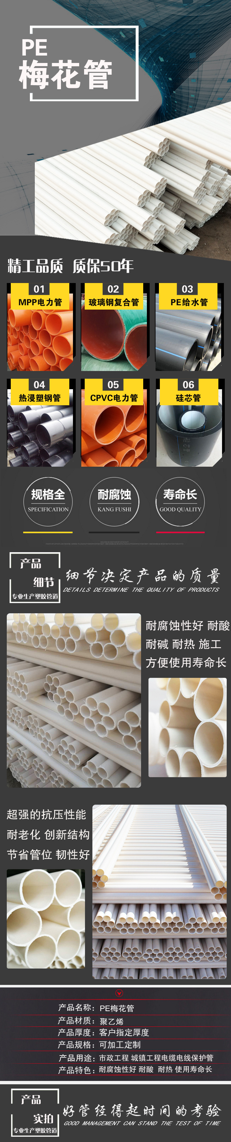 HDPE多孔管是以HDPE(高密度聚乙烯)為原料,經擠出機一次擠塑成 型生產,各單孔壁相交,緊密熔界的一種線纜護套管材。產品具有防水、 防潮、抗老化、使用壽命長、耐侯好的特點,同時由于它是一次性成型 的一體化多孔護套管,所以施工方便,增加了預埋孔數,提高了施工速 度,大大降低了工程單位的材料及施工成本。